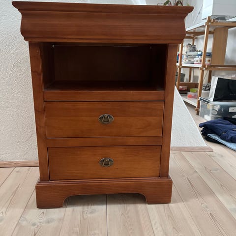 Ett sängbord i teak säljes i befintligt skick, se bilder.