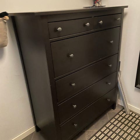 Byrå med 8 lådor, ommålad och utbytta knoppar/handtag från ikeas original. Använd och några färg bortskrap på vissa ställen men fullt fungerande och väldigt praktisk. Stora lådor med plats för mycket förvaring!