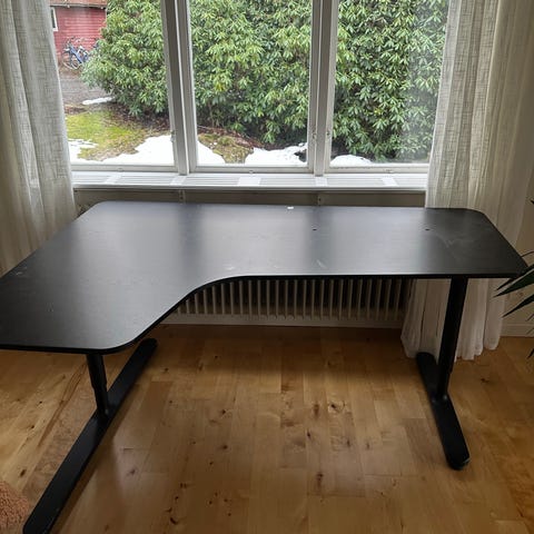 IKEA Bekant skrivbord i björk, mått 160x120 cm. Hörnskrivbord med sväng vänster.