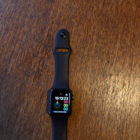 Apple Watch Series 5 smartwatch med grått silikonband. Utrustad med fyrkantig pekskärm och flera sensorer på baksidan för hälsomätning och aktivitetsspårning. 45 mm, GPS, Aluminium, ceramic case, laddkabel ingår-usb