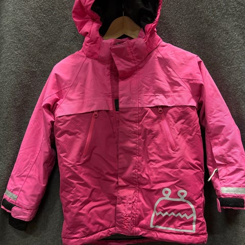 Kaxs fodrade galonbyxor för barn i storlek 98/104. Byxorna är mörkblå och har hängslen och resår vid bensluten samt elastiska fothällor som är hela. De är vattentäta och perfekt för slask!