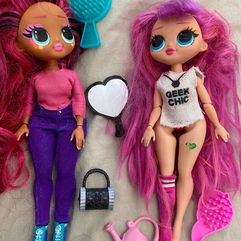 L.O.L. Surprise samling med flera dockor och tillbehör i olika storlekar och färger. Inkluderar mindre och större dockor med olika hårfärger och kläder samt olika tillbehör som skor, väskor, flaskor och möbler. Lämplig för barn och samlare. Bilen är för de större dockorna. Det fattas en del till bilen.