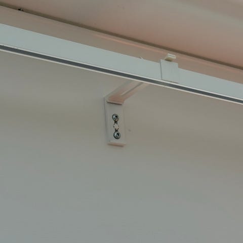 IKEA gardinskena i vit färg. Inkluderar skenor, krokar, fästen och skruvar för montering. Passar för upphängning av gardiner och textilier.