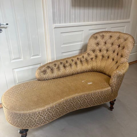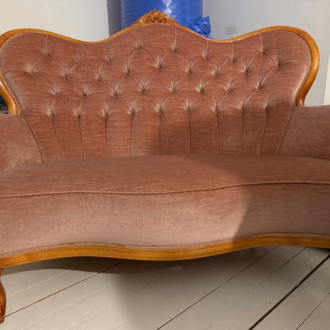 En fin Louis XV rokokostil kanapé , röd sammet , guldpläterad, stabil trästomme, dunstoppade sittkuddar . B 75, H 89( högst) , L 190 cm