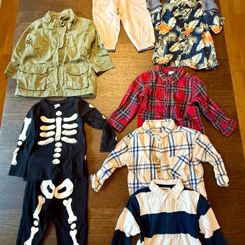 H&M, Lager 157, Kizz m.fl. barnkläder för pojke i storlek 120, 122-128 med flerfärgat mönster. Kläderna består av olika plagg inklusive jeans och tröjor i varierande färger och motiv.