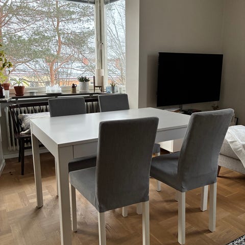 Bord (förlängningsbart Laneberg) och stolar (Bergmund) från IKEA.