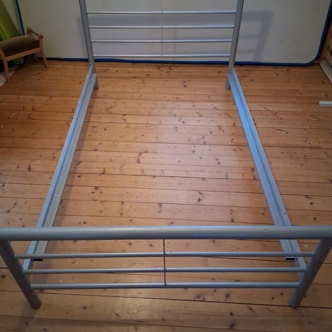IKEA metallram säng med enkel design i metall. Passar som en enkel sänglösning i olika rum. Rammemadrass, resårbotten.Selges for kr 900,-