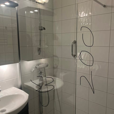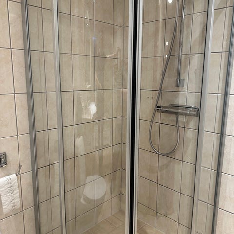 Duschhörna med glasväggar och duschset
