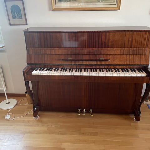 Enligt AI: Östlind & Almquist Upright Piano i mahogny. Pianot har ett traditionellt utseende med tre pedaler och en klassisk design. Passar för användning i hem eller musikstudior. Östlind & Almquist pianoforte i trä med klassisk design och två pedaler. Instrumentet har en polerad träyta och är lämpligt för musikstudier och hemmabruk.