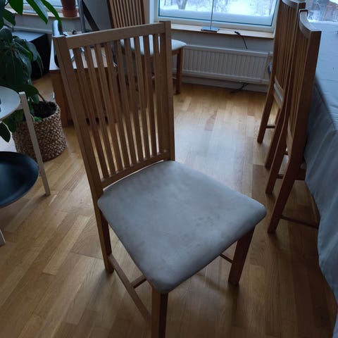 En av stolarna har tappat två små pluppar på baksidan (se sista bilden), i övrigt är de i fint skick.