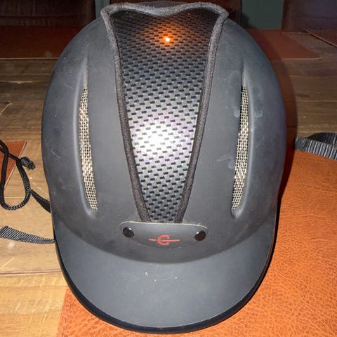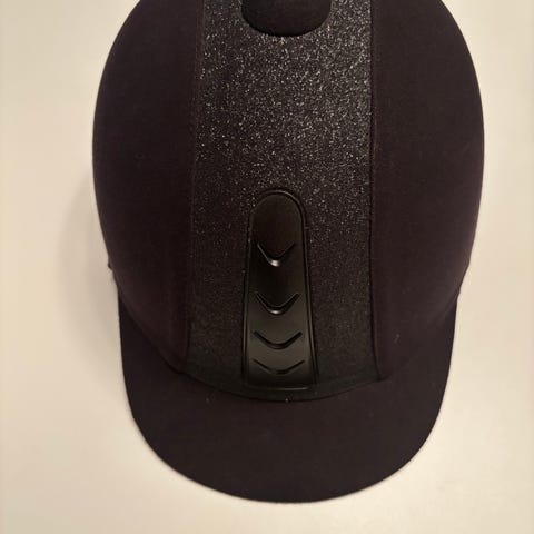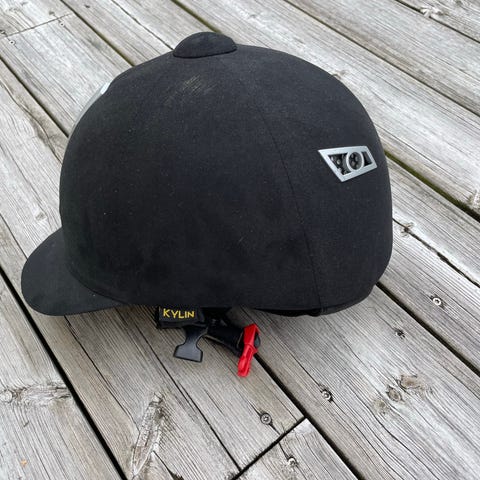 Kylin ridhjälm i svart och grå färg. Hjälmen har en justerbar rem och är utformad för att ge skydd vid ridning.Hjälmen inte har fallit i marken. 57cm