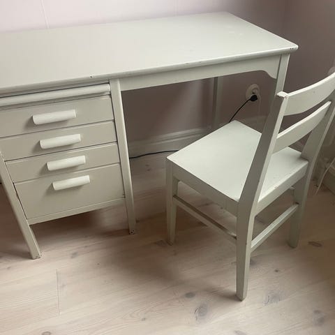 Gedigen skolbänk tillverkad av Tranås skolmöbler år 1955. Flitigt använd, men klarar sig säkert i ytterligare 70 år 😊