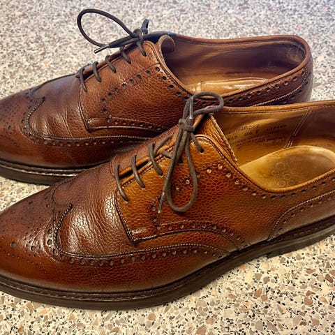 Skorna har ingått i skorotation, alltid använts med en inlägg sula, då lästen inte riktigt passade mig - man kan se avtrycken av inläggsulan på innersulan. Skorna har blivit vårdade med Saphirs produkter.