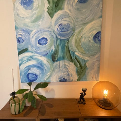 Inramad tavla med blommotiv i blått och beige