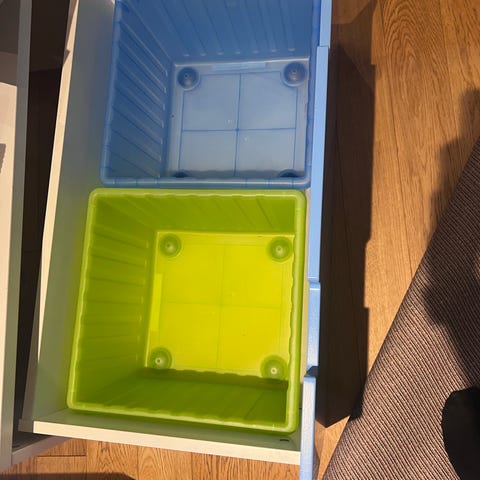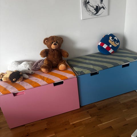IKEA Förvaringslåda för barnmöbler i grå färg. Lådan är utformad för att passa under barnsängar och används för förvaring av sängkläder eller andra föremål. Tillverkad av hållbart material med enkel design för funktionell användning. Mått 99x91x29 cm