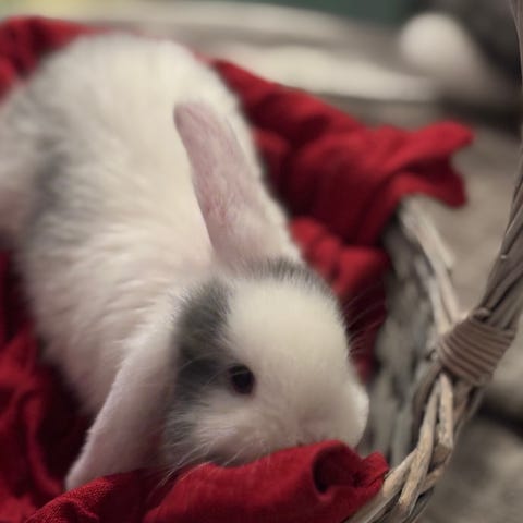 Olof heter den här lilla minilopen. Han är tillgiven och en supergullig liten kille som älskar att gosa, bli klappad och upptäcka världen utanför buren.
