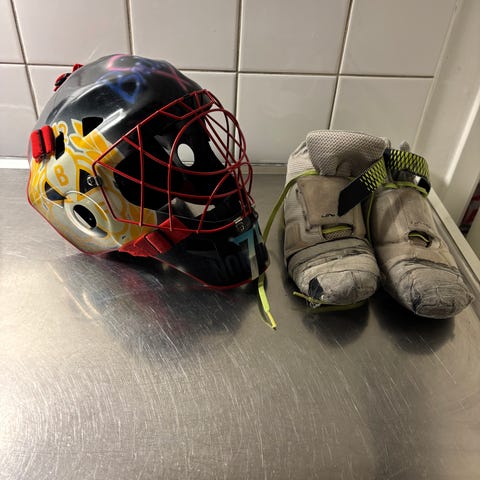 Promask innebandymålvaktsmask i vit färg. Hjälmen är ca 1,5 år gammal. Är i bra skick. Men den har spruckit på ena sidan på hakan. Där av priset.