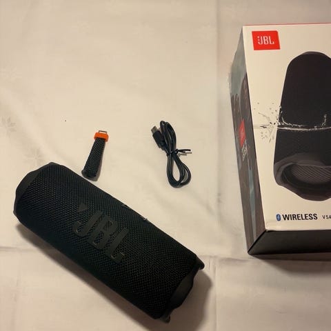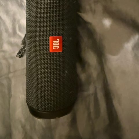 JBL Bluetooth-högtalare i svart färg med bärrem för enkel transport. Högtalaren är bärbar och lämplig för trådlös ljuduppspelning.