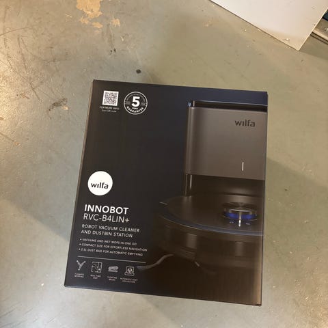 Wilfa Innobot RVC-D 4000 SL robotdammsugare. En automatiserad städprodukt som är utformad för att underlätta rengöring av golv. Produkten inkluderar laddstation och tillbehör för drift och underhåll.
