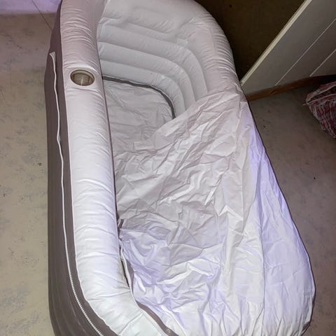 Uppblåsbart badkar i rosa färg med inbyggd nackstöd. Tillverkad i slitstarkt material och designad för enkel uppblåsning och tömning.