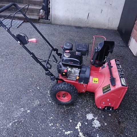 MTD M56 snöslunga med röd färg och bensindriven motor. Utrustad med handtag för manuell styrning och justerbar utkastare för snö. Maskinen är avsedd för snöröjning och har robust konstruktion för utomhusbruk.