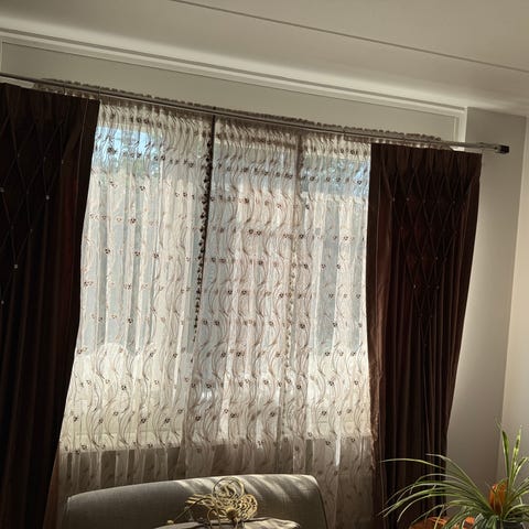 Den ena förpackningen är obruten. Den andra öppnade vi och konstaterade att gardinen var för kort för att hänga från taket, även om den ju är i standardlängd.