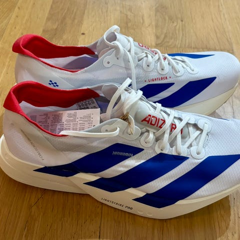 Adidas Adizero Pro löparskor i storlek 42. Skorna är designade för löpning och har en vit färg med detaljer i blått och rött. Materialet är anpassat för sportanvändning.