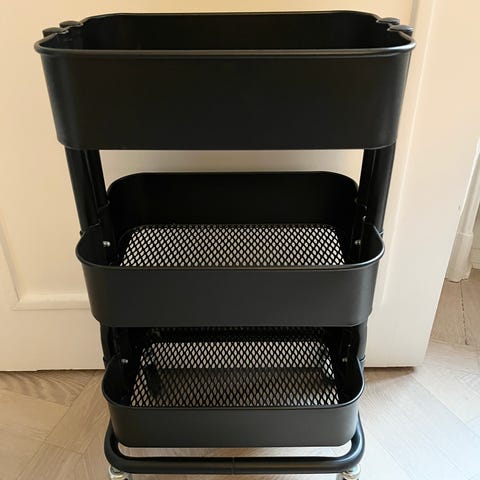 IKEA RÅSKOG rullvagn i svart med tre hyllor och en träskiva på toppen. Rullvagnen är utrustad med hjul för enkel förflyttning och har en kombination av metall och trä som material. Passar för förvaring och organisering i olika rum.