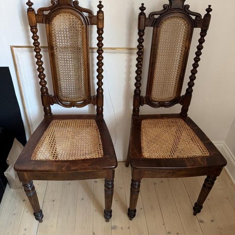Fyra stolar. Två har ok rottingsitsar, men av dem är rottingen utbytt någon gång och lite annorlunda. Stolarna är lite rangliga och benen skulle behöva limmas om. Liknar Thonet.