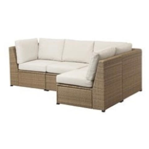 IKEA Sollerön hörnsoffa med beige dynor, anpassad för utomhusbruk.