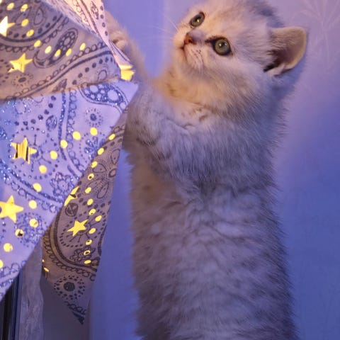 Katt med lång päls i ljusbrun och beige färg med blå ögon. Pälsen är fluffig och mjuk. Kattens ansikte har tydliga drag med mörkare färg runt ögon och nos.