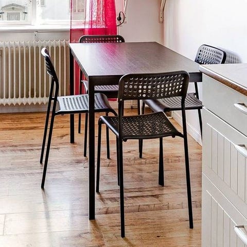Smidig design där stolarna kan skjutas in under bordet, perfekt för mindre kök, kontor eller som extra matplats. Stabil och funktionell.
