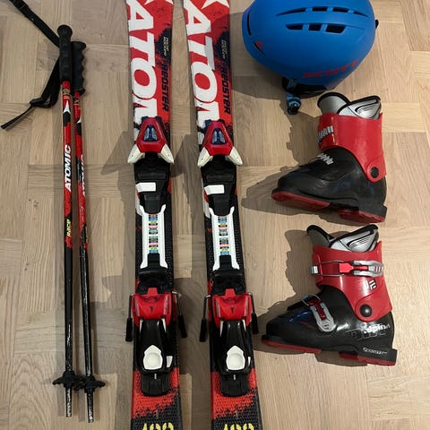 Head Free Team skidor med bindningar och pjäxor. Skidorna är 103 cm långa och pjäxorna har storlek 165/16.5 (26-27 vanlig storlek)