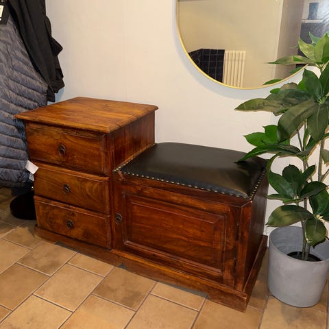 Rustik hallmöbel i massivt, brunt trä och sittdyna i svart läderimitation (sitthöjd 46cm)Gott om förvaring; tre lådor och ett större skåpsutrymme. Stor matchande hallspegel, 120x80cm (yttre ram). Pris för set.