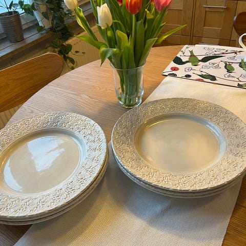 4 stycken fina grå tallrikar i modellen Lace från Mateus.