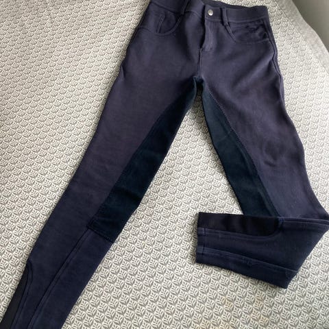 Kingston ridbyxor i svart färg, storlek 150. Helskodda. Byxorna har detaljer i mönstrat material på insidan av benen och är designade för ridning. Materialet är anpassat för komfort och funktion vid ridning.