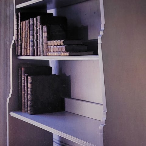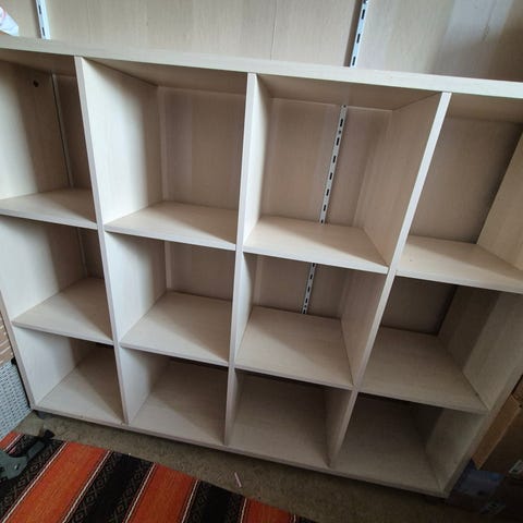 En jättefin boksnurra på hjul. Stabil och gedigen boksnurra / öppen displayhylla i mörkbetsat trä med klassisk ribbkonstruktion på alla sidor.
