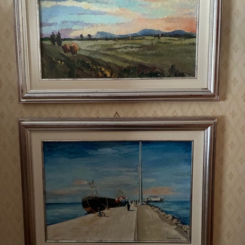 Den övre målningen visar en fruktskål med vindruvor och äpplen.