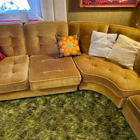 Äldre men stabil och skön hörnsoffa. Bekväm att sitta i. Brunt tyg, dock missfärgad/solblekt på några delar, se bilder. Delas i två delar. Hämtas av köparen i Torshälla.