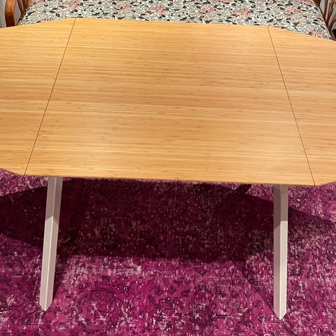 Extendable table. Used 1 year. Bought new. No scratch, no stain. 2 white chairs