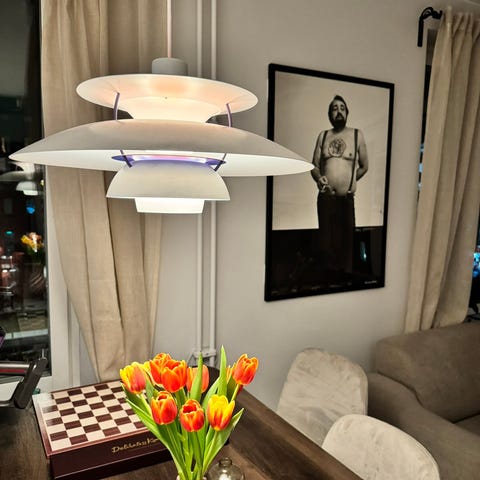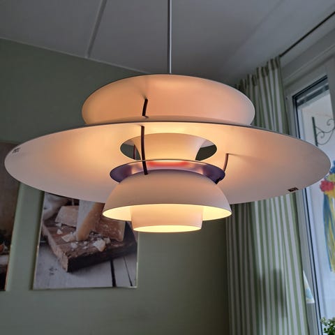 PH 5 pendel från Louis Poulsen avger ett helt bländfritt ljus både nedåt och åt sidorna, vilket gör att den passar utmärkt som lampa över exempelvis matsalsbordet.