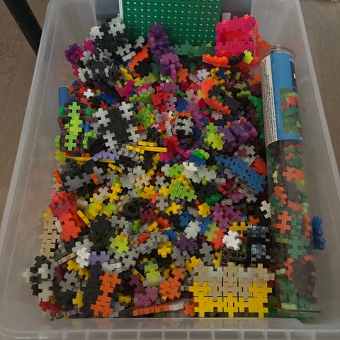 Plus Plus byggleksak i plast med 405 bitar i olika färger samt 100 neon färgade. En blå förvaringslåda i plåt med handtag och innehåller även en grön byggplatta samt instruktioner för konstruktion.