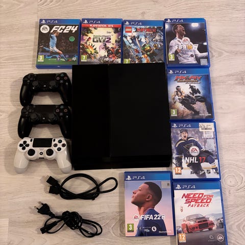 Sony Playstation 4 spelkonsol för videospel. Enheten har en svart färg och levereras med två trådlösa handkontroller i svart och rött. Konsolen är avsedd för hemmabruk och spelunderhållning. Spel till finns också.