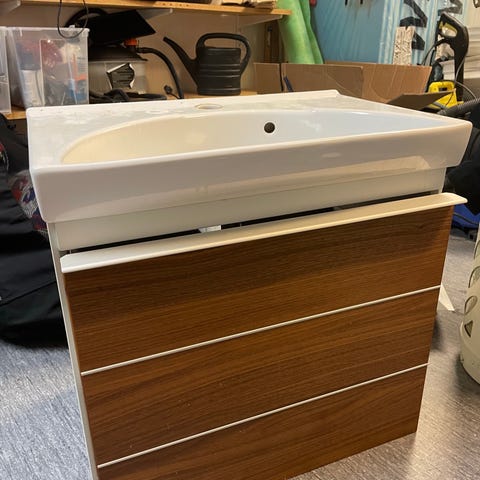 Komplett Kommod ifrån ikea med handfat i Skåpet har två utdragbara lådor under handfatet för förvaring. Passar för badrum och erbjuder funktionell förvaring i kombination med handfat