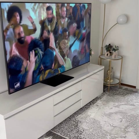 Tv-bänken har skada på ovansida men täcks av glasskiva.