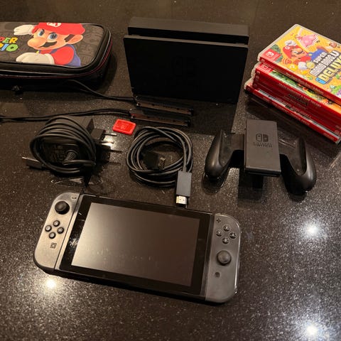 Konsol med två joy cons (blå och röd kontroll) , går att ta av