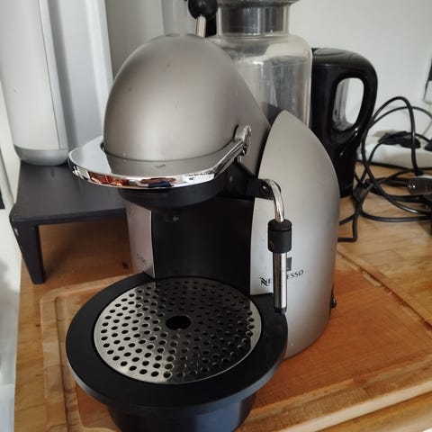 Passa på att fynda denna kaffemaskin från Nespresso, precis rengjord och i mycket fint skick! Masminen hämtas i Hagastaden (Vasastan). Tyvärr saknas spillpricka och den lilla vispen, därav det mycket förmånliga priset. Vad jag kunnat se så går det att beställa reservdelar, vilket kan göra det möjligt att få en komplett, exklusiv maskin för billig peng :-)