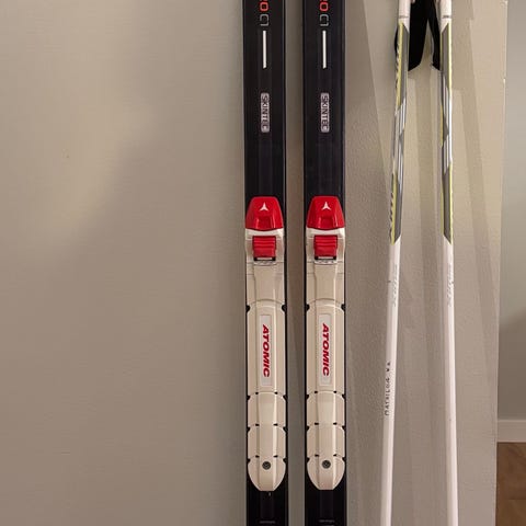 Atomic längdskidor med tillhörande stavar. Skidorna är röda med svart och vit design. Passar för längdskidåkning.
