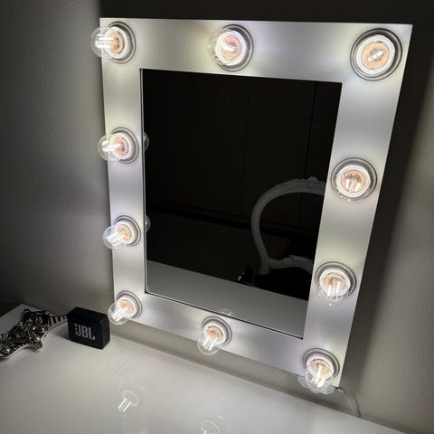 Spegel med inbyggda lampor runt ramen. Spegeln är rektangulär och har en vit ram med sex ljuskällor för jämn belysning. Mått 55cm x 45cm. Djur och rökfritt hem.