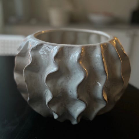 Stor metallkruka i mässing med rund form och räfflad design. Passar för inomhusdekoration och plantering av större växter. Nytt pris 990 SEK.